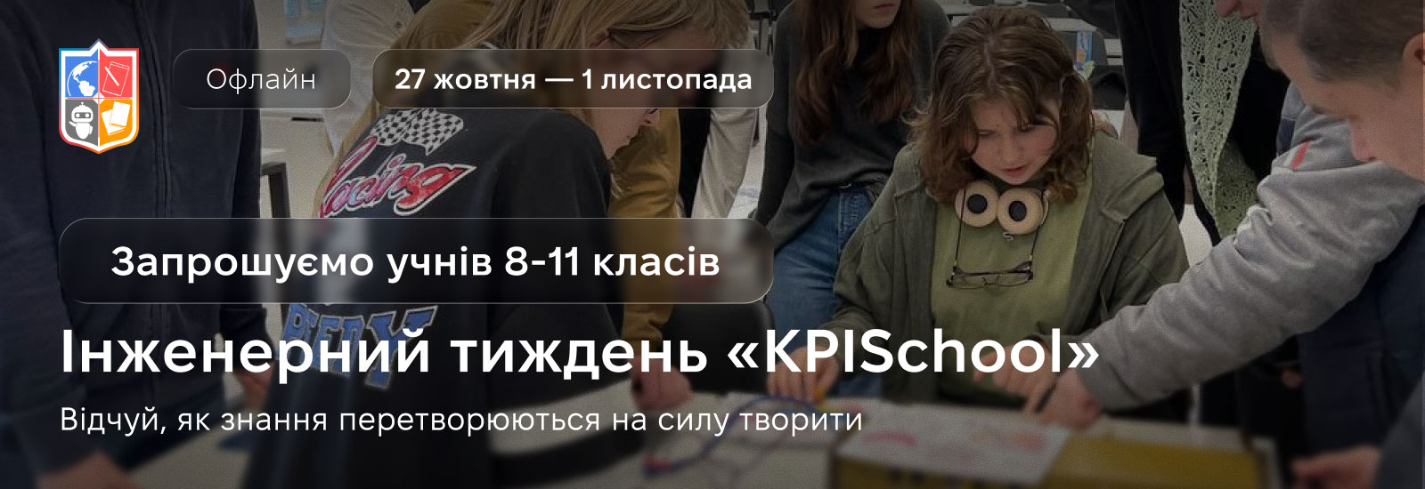 КПІ ім. Ігоря Сікорського запрошує учнів 8-11 класів на Інженерний тиждень «KPISchool» з 27 жовтня по 1 листопада 2025 року.