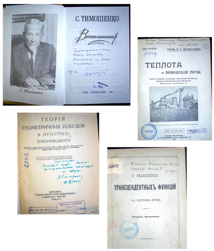 Також з дарчими написами маємо роботи хіміка і ректора КПІ М.І. Коновалова – "В библиотеку Политехнического института"; математика І.І. Белянкіна – "В библиотеку Политехнического института. 4 марта 1899 г."; хіміка-технолога, ректора КПІ К.Г. Дементьєва – "В дар библиотеке Киевского Политехнического Института от автора"; математика О.С. Смогоржевського – "Библиотеке Киевского ордена Ленина политехнического института от автора. 10.8.1949"; всесвітньо відомого вченого-механіка С.П. Тимошенка – "В дар библиотеке КПИ 27/XII-95г."; професора І.О. Мікульонка "Родной библиотеке Киевской политехники с благодарностью (підпис автора) 23.09.15"; випускника КПІ Л.К. Голишева "В дар библиотеке КПИ от бывшего студента Альма-матер. Л. Голышев, 30.03.2015" та інші.
